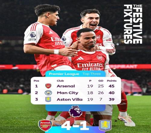 英超第19轮,阿森纳主场4-1大胜维拉,目前,阿森纳以5分优势领跑积分榜,锁定本赛季英超半程冠军。